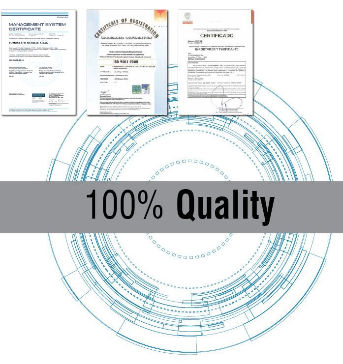 Como buen equipo europeo, TOMASETTO ACHILLE cuenta, tanto en GNV como en GLP, con los certificados de seguridad UN/ECE R67 para GLP y UN/ECE R110 para GNV, lo que garantiza una instalación segura, pues todos los elementos importantes que componen el kit de instalación, han sido probados y certificados para su uso en el mercado europeo. Además de su respectivo Certificado ISO 9001.